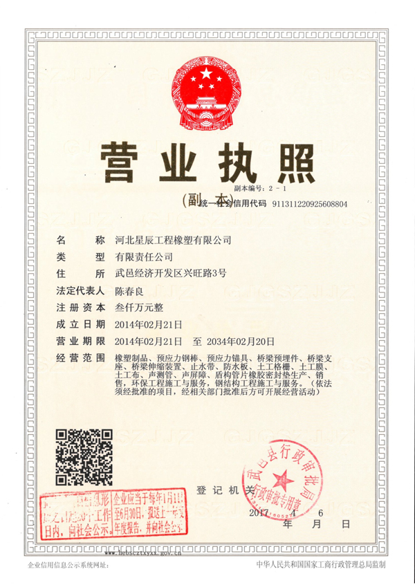 河北星辰工程科技有限公司成立于 2014 年 02 月,公司坐落于衡水市武邑县城南工业园区,占地90 亩,总投资3.25亿元。公司集理论研究、设计、生产、检测、销售、售后服务为一体,主要经营:预应力钢棒、预应力锚具、桥梁支座、桥梁伸缩装置、止水带、防水板、土工格栅、土工膜、土工布等。